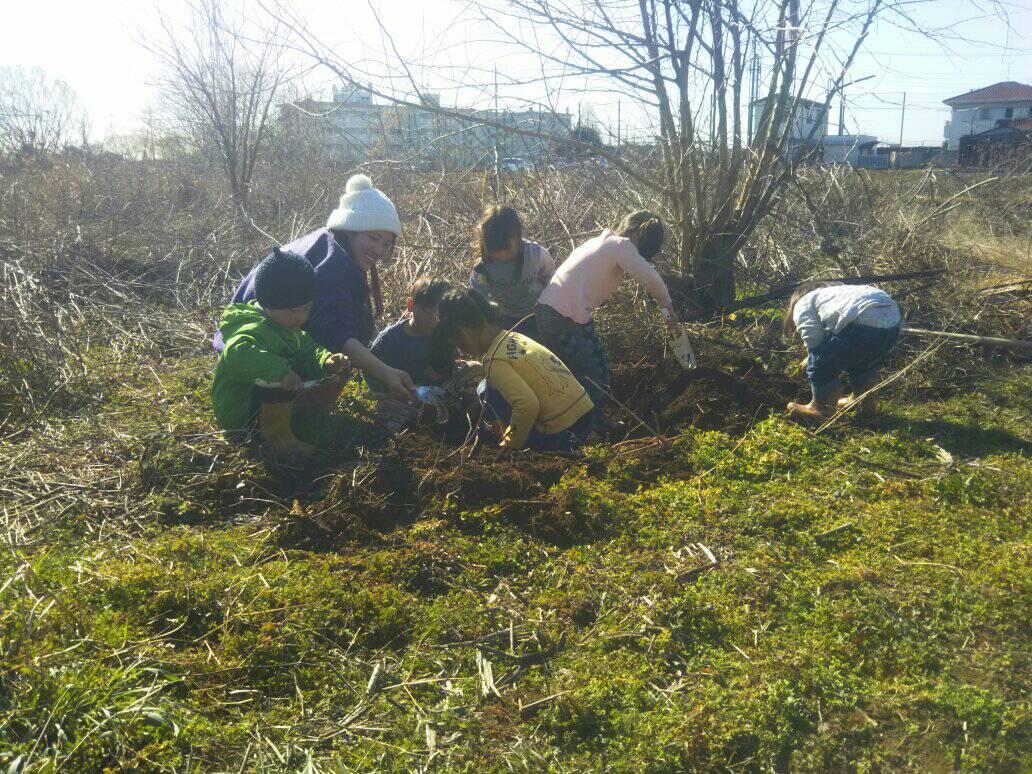 体験の学び 森のようちえん 2020年05月10日 土に触れて感触を確かめ、鍬とスコップで畝を作り、芽を残して種イモを切り、病気にならないように灰を塗る。穴を開けて自分の手でジャガイモを埋めて、収穫を楽しみにする。虫を見つけて、友だちとケンカして、大声で思いっきり泣いて。そしてみんなでごはん!これが学びでなくて何だというのか!(笑)PR